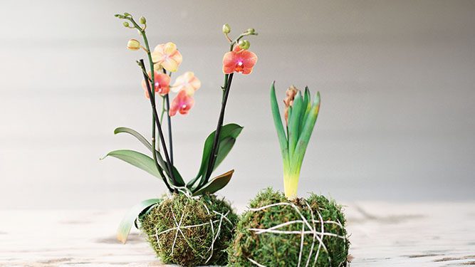 This Japanese art form encases a plants root ball with soil, moss, and string, forming a containerless sculpture that can be hung or placed on a shallow vessel.