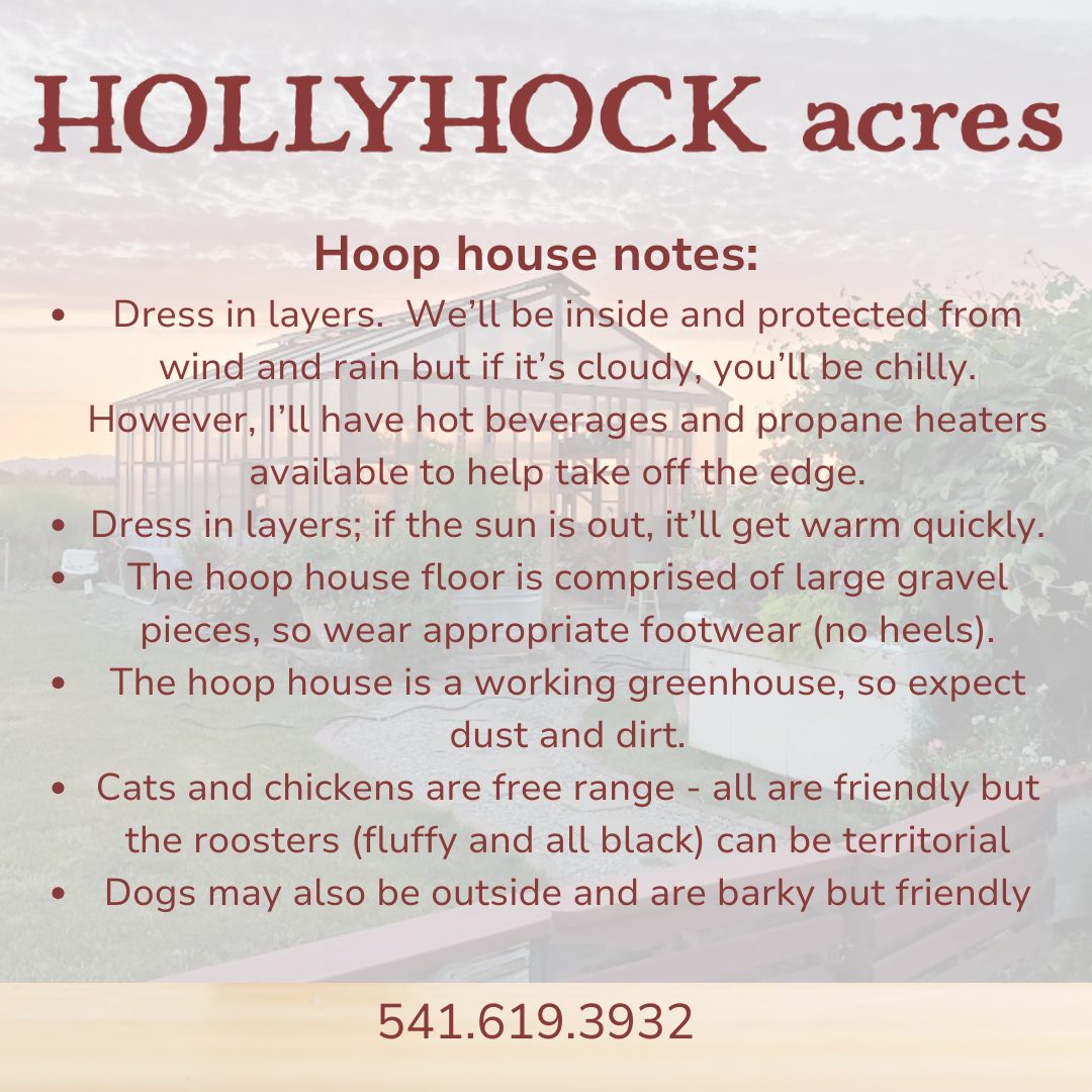 Hollyhock Acres is located in a farming community; participants should dress accordingly and prepare to be exposed to dust, water, noise, and the close proximity of farming machinery.