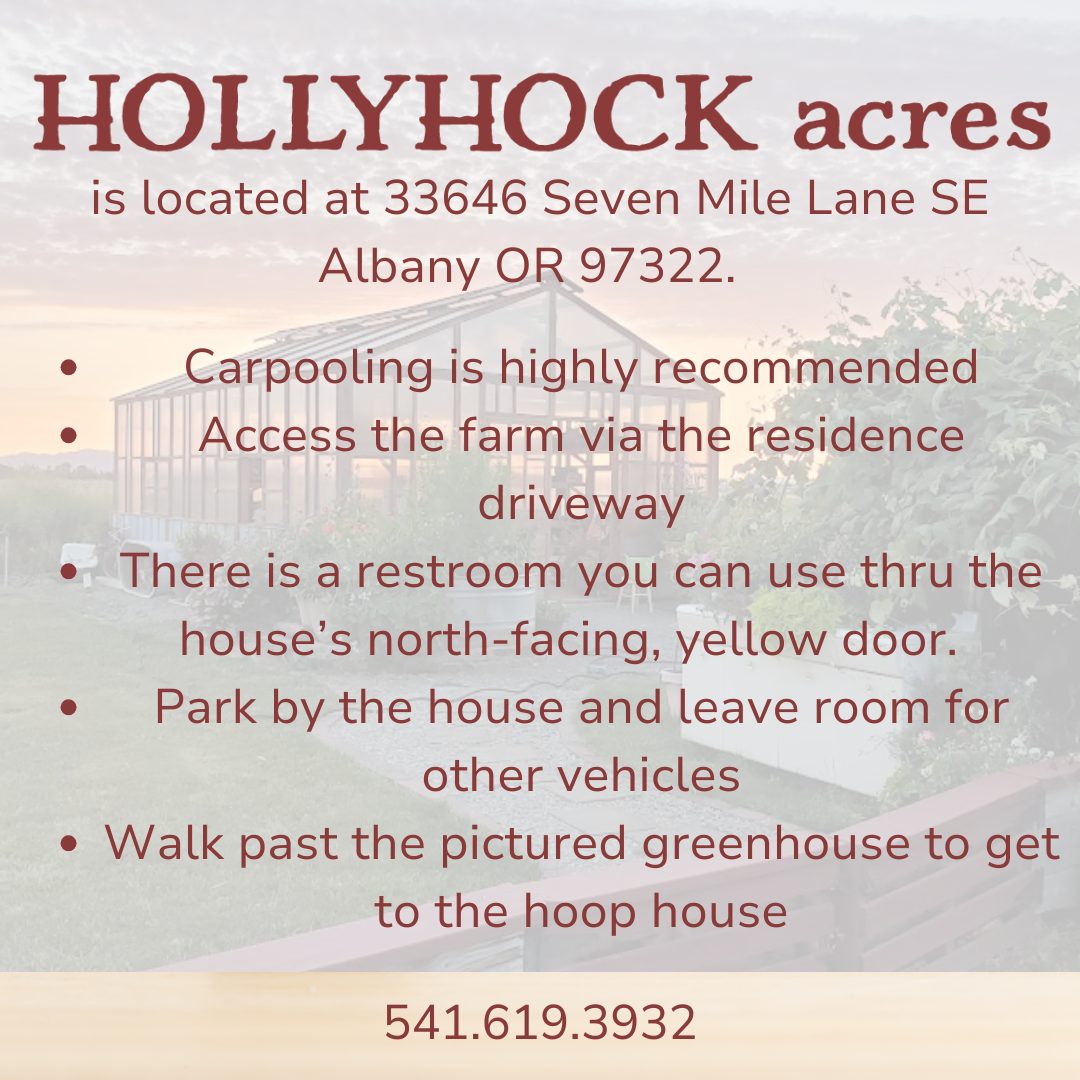 Park in the lots near the residence and then walk...events will be either in the Drs. Office or the large hoop house. A restroom is available as needed in the residence - yellow door, north end of the house. Also note there are free-range cats and dogs - all friendly!