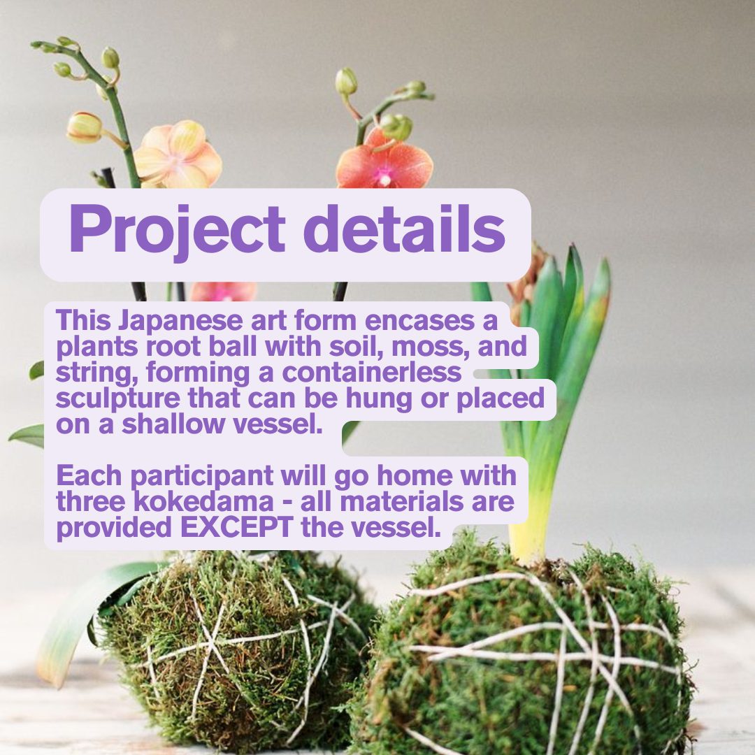 Each participant will go home with three kokedama – all materials are provided EXCEPT the vessel.